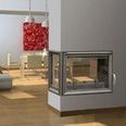 Туннельная (сквозная) топка со стеклом справа встраивается в колонну или в торец межкомнатной перегородки так, чтобы можно было любоваться пламенем с трех сторон.