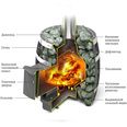 Печь-сетка вмещает почти 90 кг. камней. Камни экранируют жесткое инфракрасное излучение от топочной камеры. Пар от каменки получается крупнодисперсным, как в настоящей русской бане. Большое количество камней позволяет поддерживать стабильную температуру в парной.